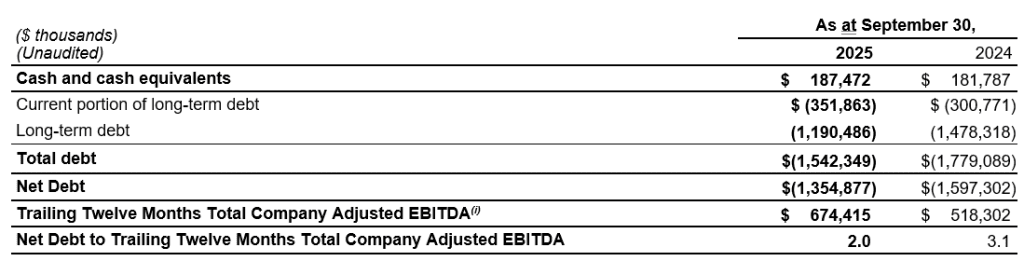 • Net Debt(ii) was $1,354.9 million, with Net Debt to Trailing Twelve Months Total Company Adjusted EBITDA(ii) of 2.0x improving from 2.1x at the end of the second quarter of 2025 and 3.1x at the same time a year ago.