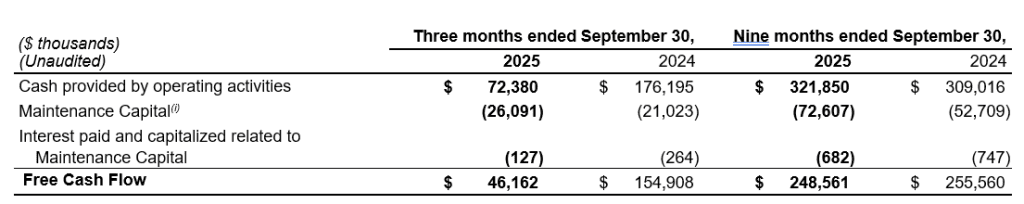 Year-to-date Free Cash Flow for 2025 was $248.6 million compared to Free Cash Flow of $255.6 million in the prior year. The decrease included higher earnings after deducting non-cash items which were more than offset by higher investment in working capital, lower tax refunds and higher maintenance capital expenditures.