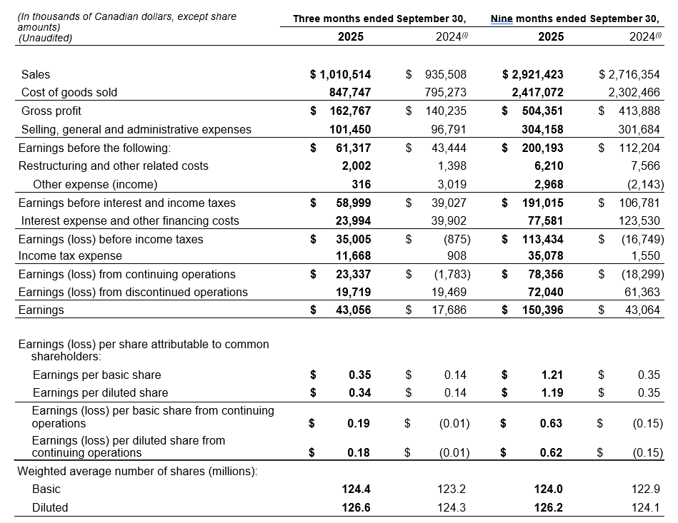 The following table summarizes the Company's sales, gross profit, earnings, basic earnings per share, Adjusted EBITDA, Adjusted EBITDA Margin, Adjusted EBT and Adjusted Earnings Per Share from their continuing operations for the three and nine months ended September 30, 2025 and September 30, 2024.