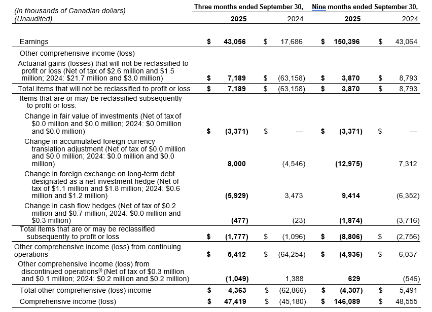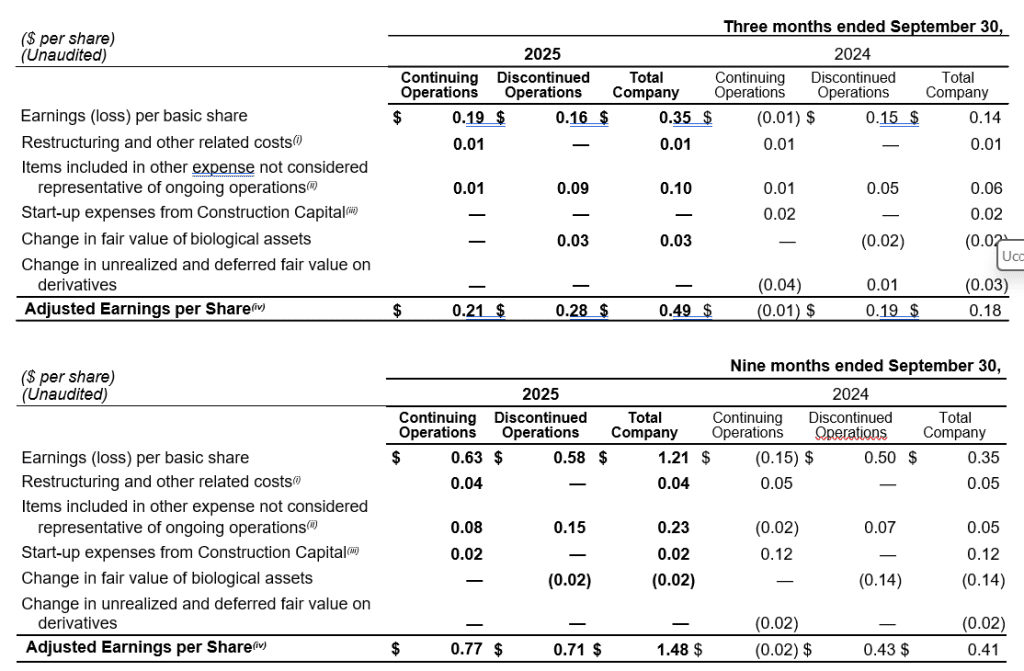 • Earnings from continuing operations for the third quarter of 2025 were $23.3 million ($0.19 earnings per basic share) compared to a loss of $1.8 million ($0.01 loss per basic share) last year. Adjusted Earnings per Share(ii) for the third quarter of 2025 was $0.21 compared to a loss of $0.01 per share last year.