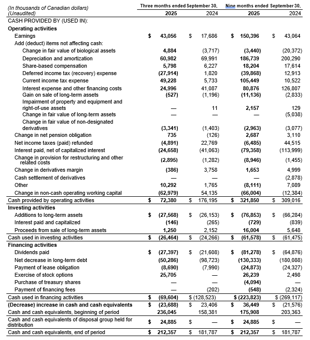 Free Cash Flow for the third quarter of 2025 was $46.2 million compared to Free Cash Flow of $154.9 million in the prior year. The decrease included improved earnings after the removal of non-cash items which were more than offset by higher investment in working capital and lower tax refunds.